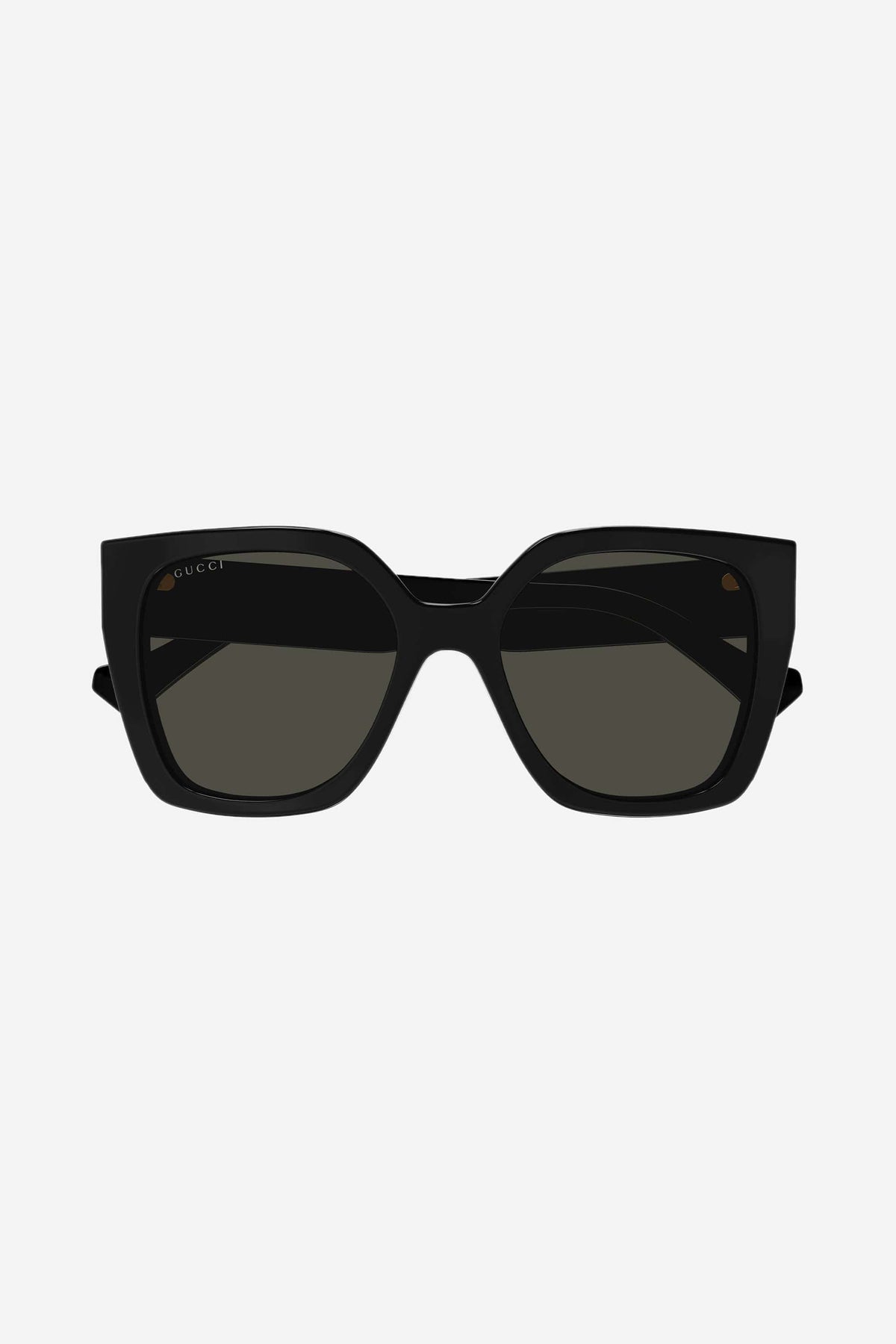 Oversize square shape. Milled temples recreating the web. Gucci lettering logo on temples. Evergreen Gucci look with a sophisticated touch.
